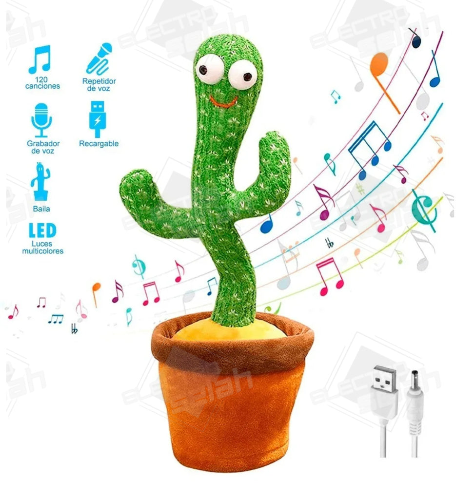 - 🎶 Diversión Garantizada: Este cactus no solo baila, ¡también repite lo que dices con una voz divertida! Un juguete interactivo que mantendrá entretenidos a los más pequeños durante horas.
