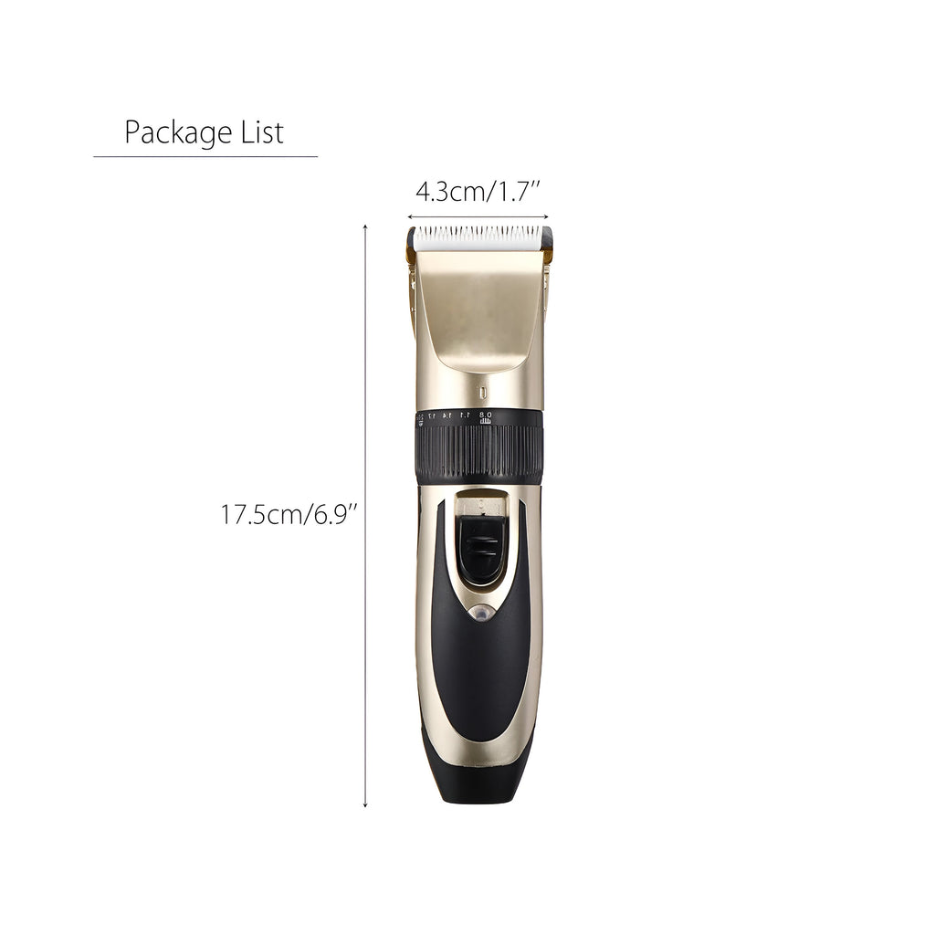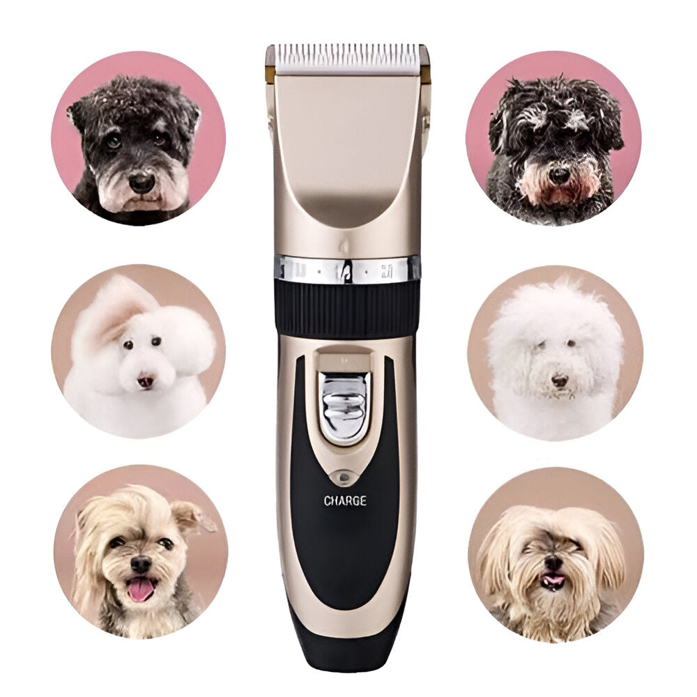 Máquina + 4 peines (3-6-9-12 mm) + cable USB + lubricante + peine metálico + lima + corta uñas + manual