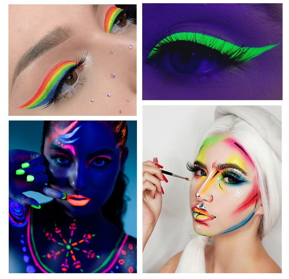 🎉 Doble Resplandor en un Solo Set: Este conjunto único no solo ofrece sombras de ojos fosforescentes, sino también delineadores activados por luz que añaden un toque especial a tu look. ¡Tu creatividad no tendrá límites, ni siquiera en la oscuridad!