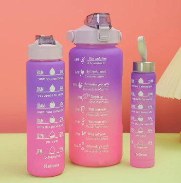 Nuestro Pack de 3 Botellas Motivacionales es la solución perfecta para mantenerte hidratado y motivado durante todo el día. Este set incluye tres botellas de diferentes tamaños que se almacenan juntas en la botella de 2L para máxima comodidad. La botella de 2L cuenta con una opción para beber con sorbete y un diseño anti derrame, mientras que todas las botellas están equipadas con un marcador de tiempo para seguir tu progreso y mantenerte inspirado. Además, cada pack incluye adhesivos para que personalices tus botellas a tu gusto. ¡Ideal para deportistas y para el uso diario!