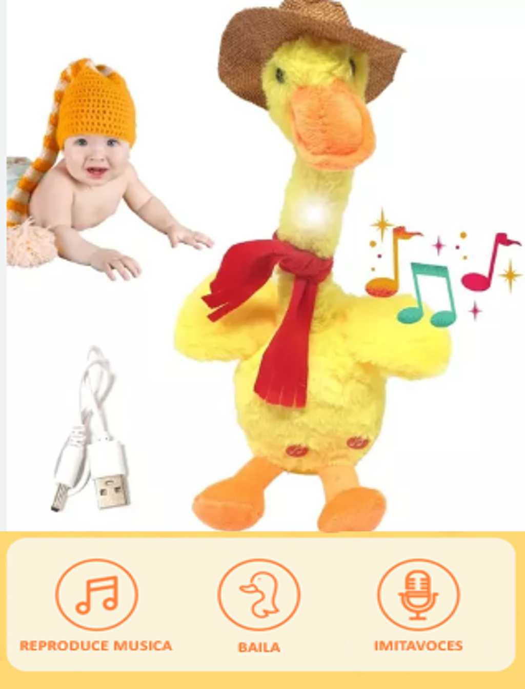El Pato Bailarín es el compañero ideal para los más pequeños, ofreciendo diversión, tranquilidad y estimulación. Este adorable peluche no solo es un amigo tierno, sino que también está diseñado para iluminar y animar el tiempo de juego y descanso. Con luces suaves y sonidos alegres, el Pato Bailarín hace que cada momento sea especial. Su material hipoalergénico garantiza que los niños puedan disfrutarlo sin preocupaciones, mientras que su cable USB incluido permite una carga sencilla para mantener las luces y sonidos activos.